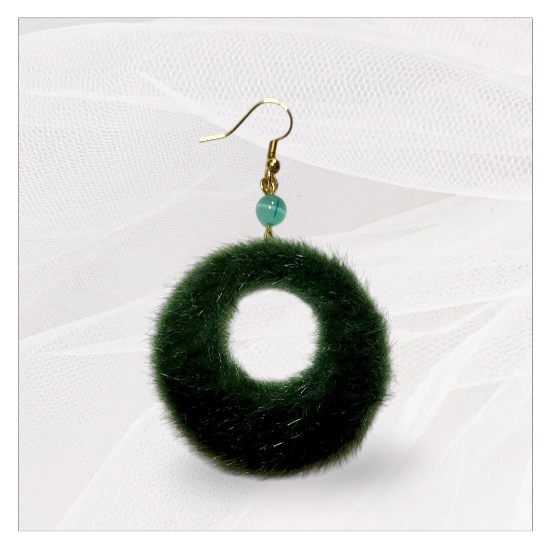 - ダークグリーン ファー リングピアス 片耳用 ハンドメイド