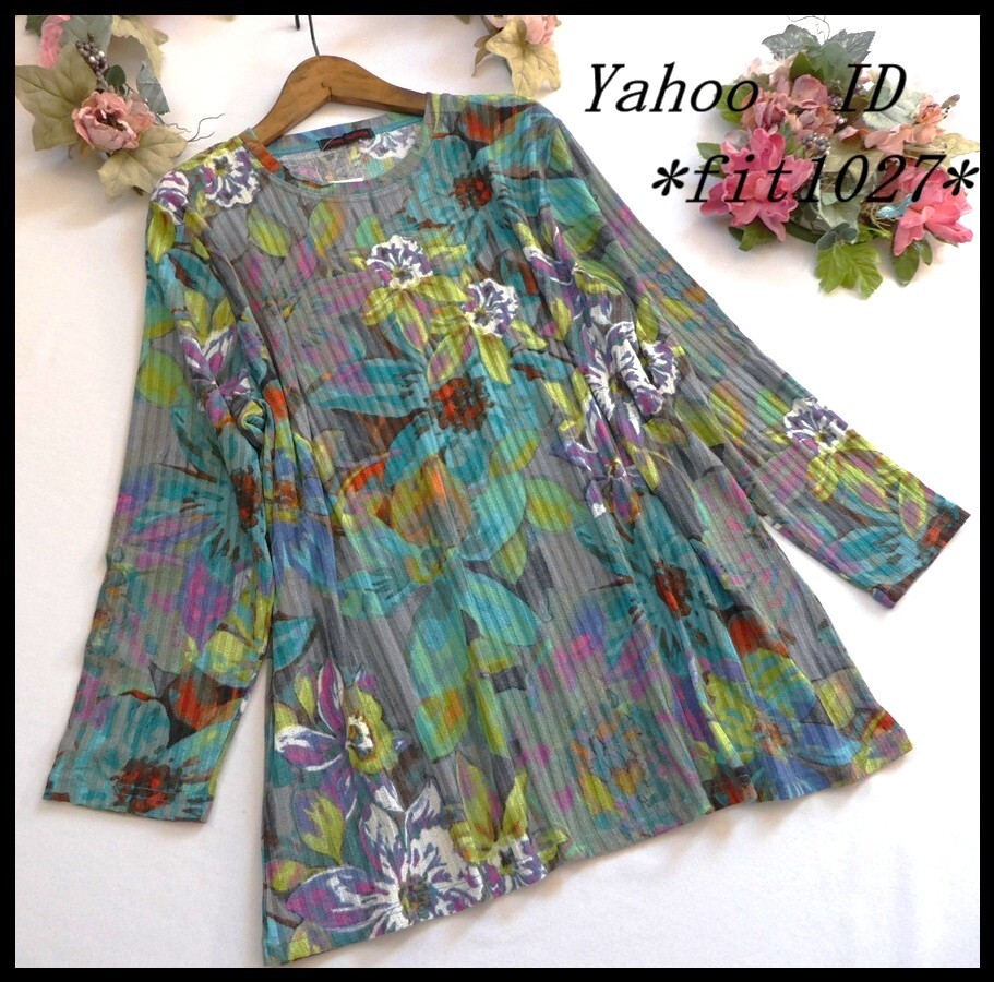 - 3~4L【新品】ボタニカルフラワー柄♪リブのニットソー素材・伸縮OK★ほんのりAラインチュニック◇グレー×青◆fit1027◆大きいサイズ