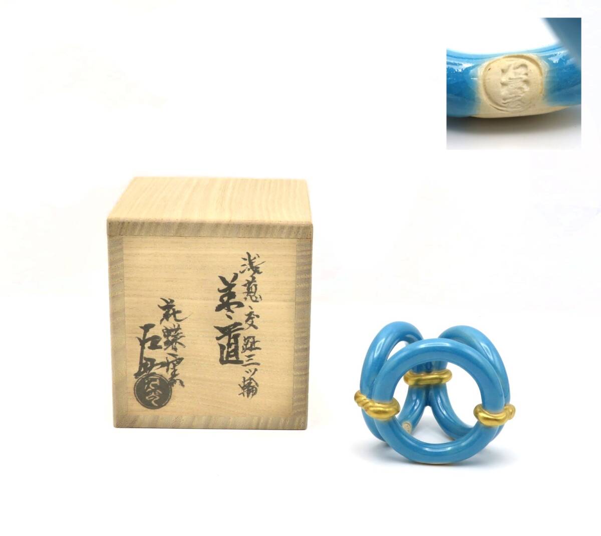- ◇真作◇ 手塚石雲 花蝶窯 『浅葱交趾三ツ輪蓋置』 共箱 共布