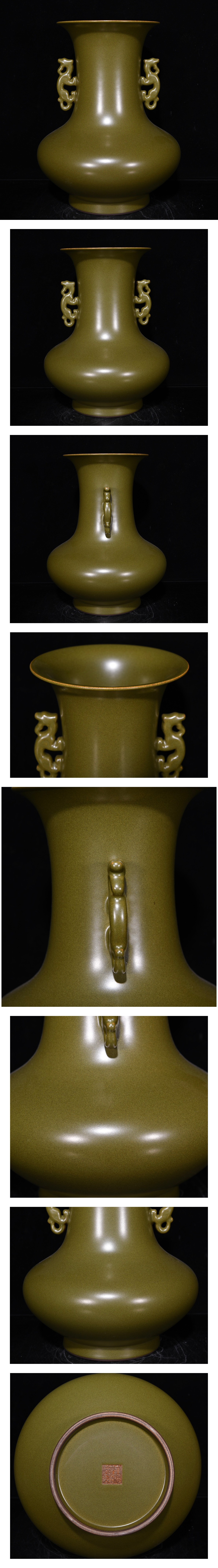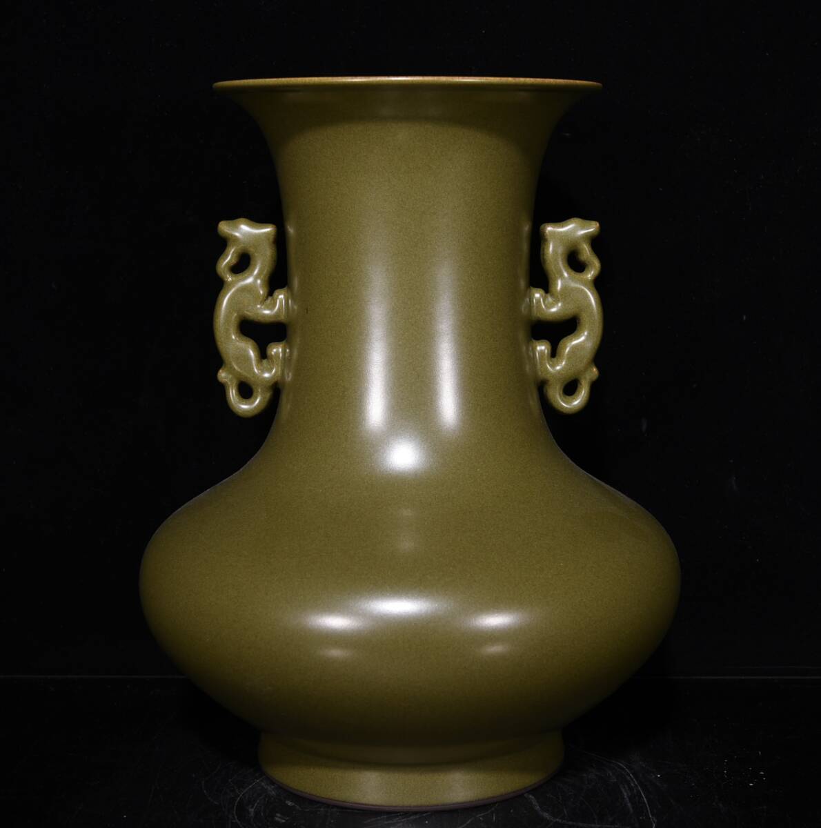- ■LM232■大清乾隆年製 在銘 茶葉末釉 官窯 双耳花瓶 時代物 古玩 唐物 古陶磁器■