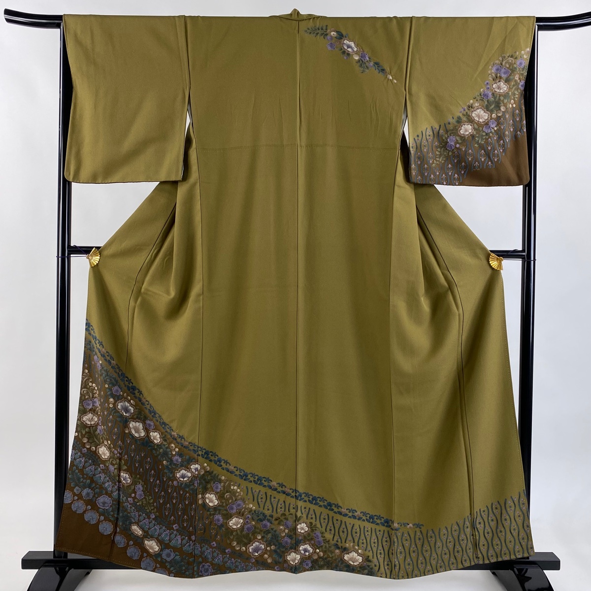- 訪問着 身丈160cm 裄丈66.5cm M 袷 草花 立涌 金彩 絞り 茶緑色 正絹 名品 【中古】
