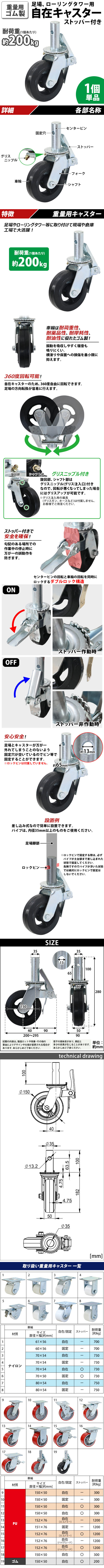 - 送料無料 キャスター 足場キャスター 自在キャスター 重量用 ゴム製 ストッパー付き 1個 単品 重量用キャスター 耐荷重約200kg(1個あたり)