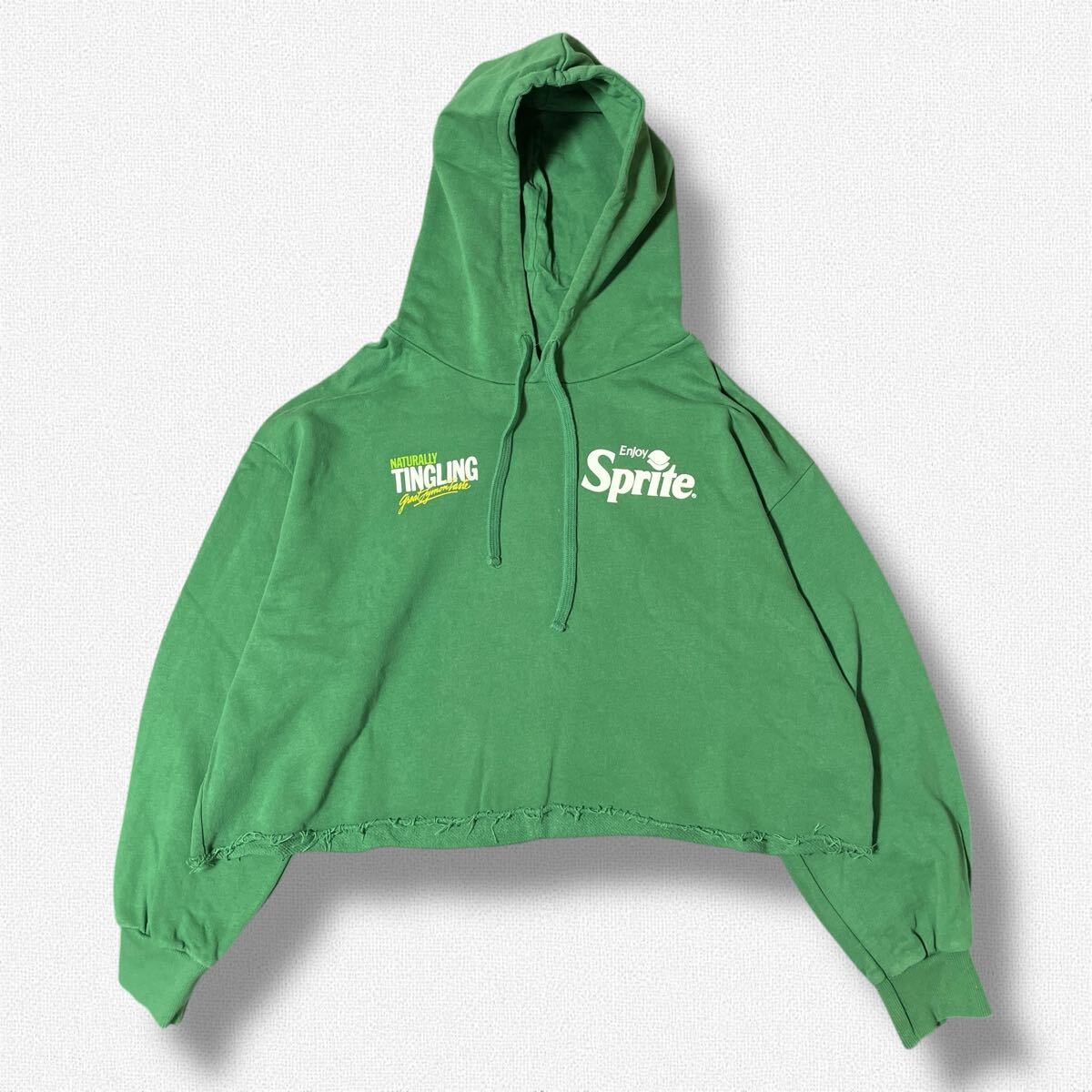 - ZARA×Spriteコラボ フーディークロップド丈パーカー グリーン L ●洗濯プレス済● ザラ スプライトコットン スウェット 緑 古着/788