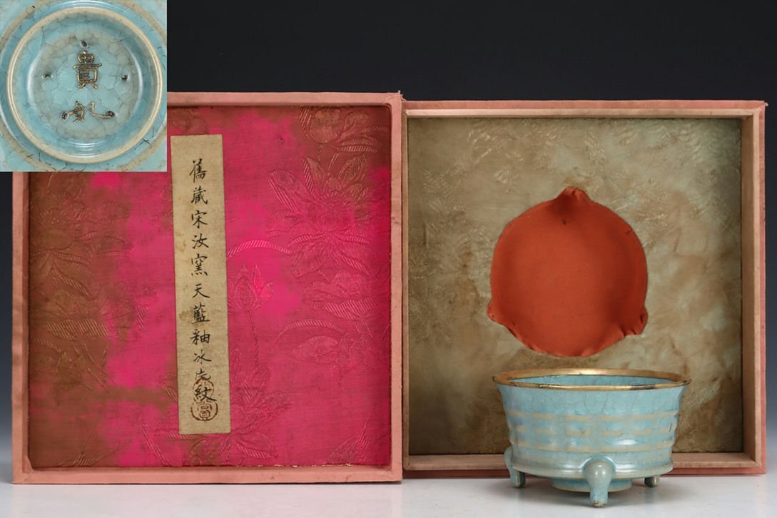 - ▼渡鶴羽▼K6352宋時代 汝窯天藍釉三足香炉・古陶磁器 ・珍品旧蔵・古賞物・時代物
