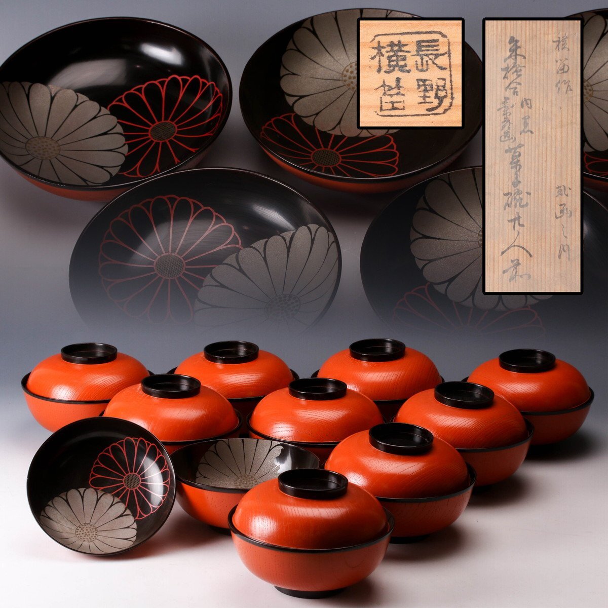 【佳香】長野横苗 朱塗内黒菊蒔絵菓子椀 十客 共箱