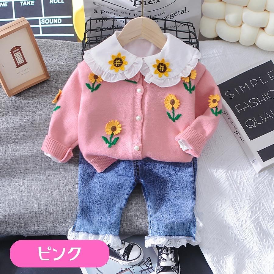 > 新品 送料無料 ピンク 90cm 3点セット ひまわり柄 カーディガン フリルレース付デニムパンツ ブラウス 上下セット キッズ服 女の子