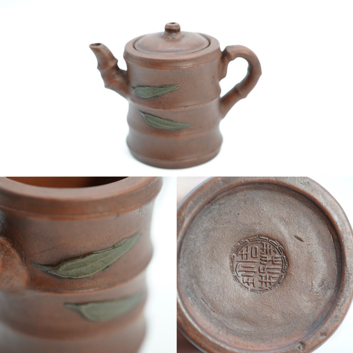 > 朱泥急須 竹モチーフ 落款印付き 紫泥製 竹節 竹葉立体彫刻 福寿紋印 文人趣味(竹) 和風茶器 お茶道具 コレクション