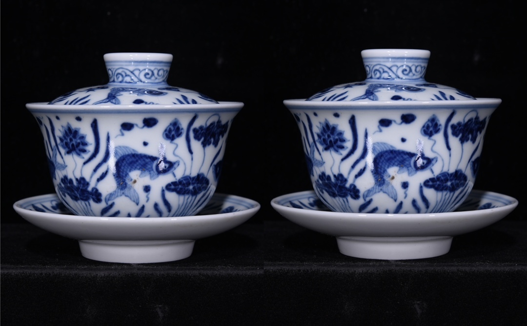 - 明時代 宣徳製款 古陶磁器 青花 魚藻紋 茶盞 一対 茶具 茶道具 時代物 古董品 骨董 旧家蔵出し 唐物 中国古玩 古美術品