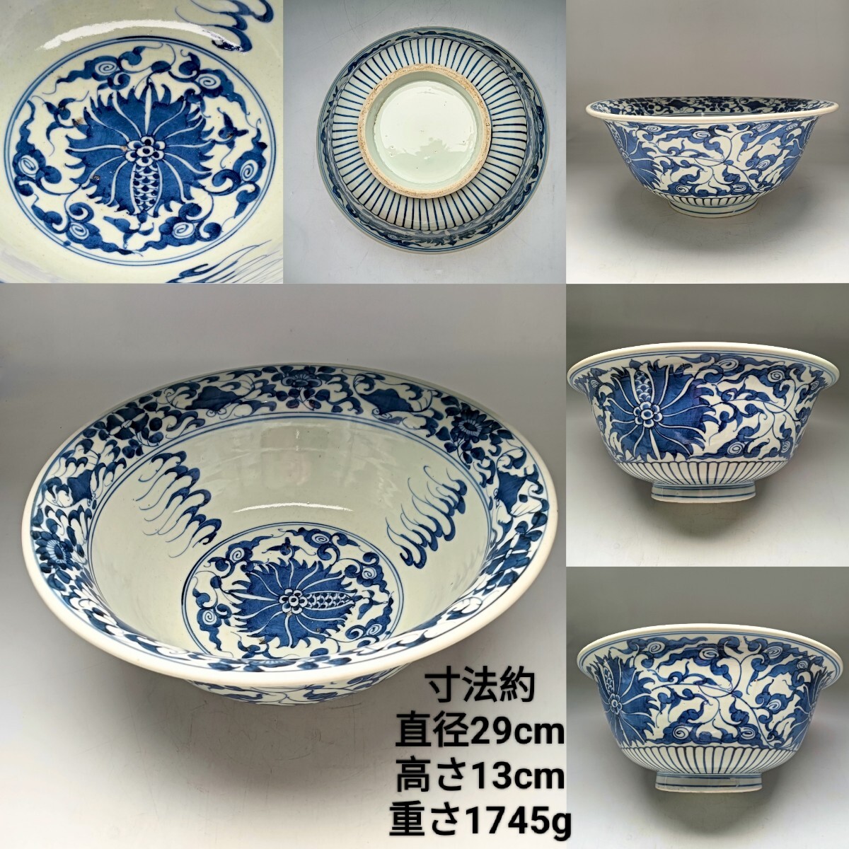 - 【W0171】青花花紋深型大鉢 皿 青花 染付 菓子鉢 陶器 唐物 中国古玩 古美術品 骨董品 アンティーク 直径約29cm 重さ約1745g