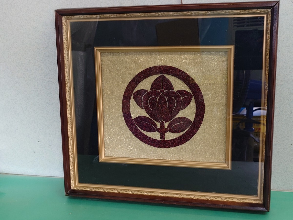 > ● 松鳩文化刺繍 文化刺繍 専用 額縁 付き 完成品 家紋 丸に橘 ハンドメイド 昭和レトロ アート インテリア 井伊直政 立体 ラメ 現状品 ③