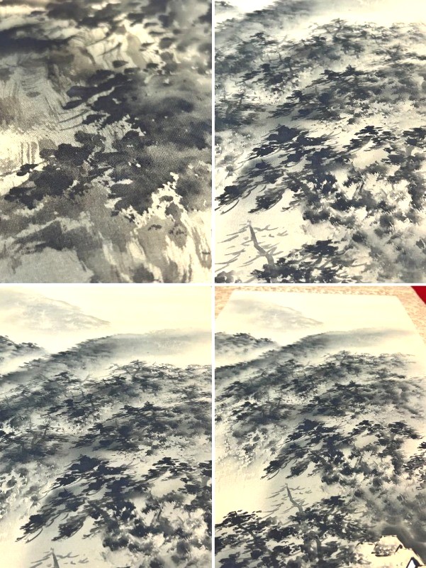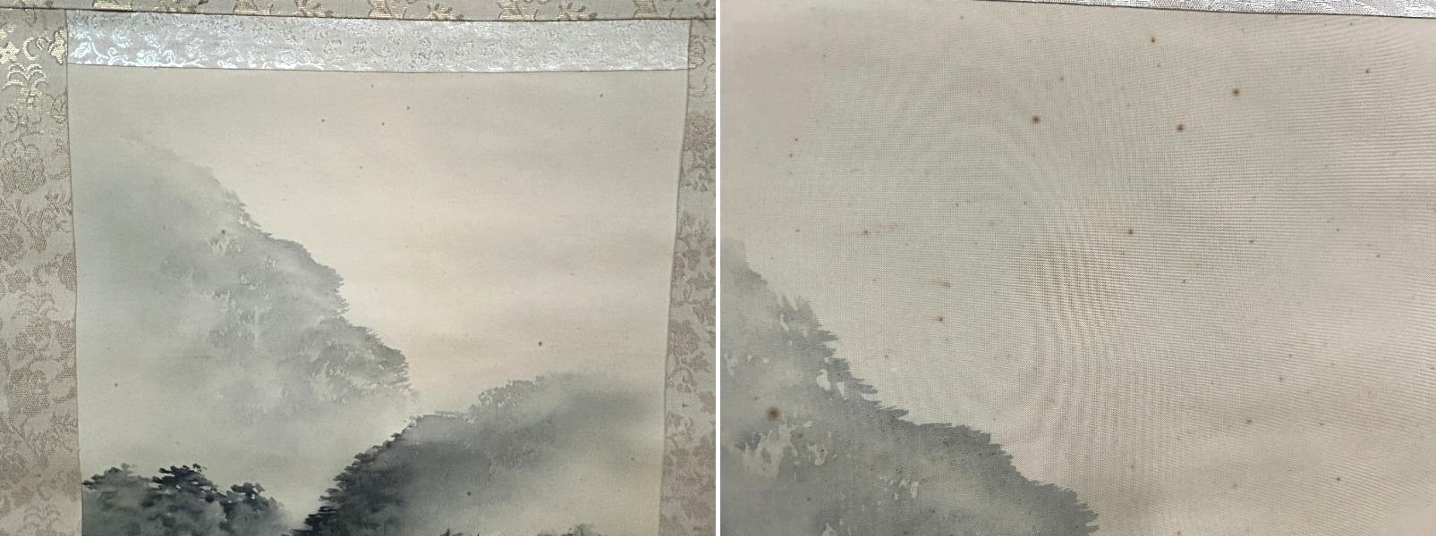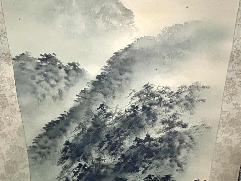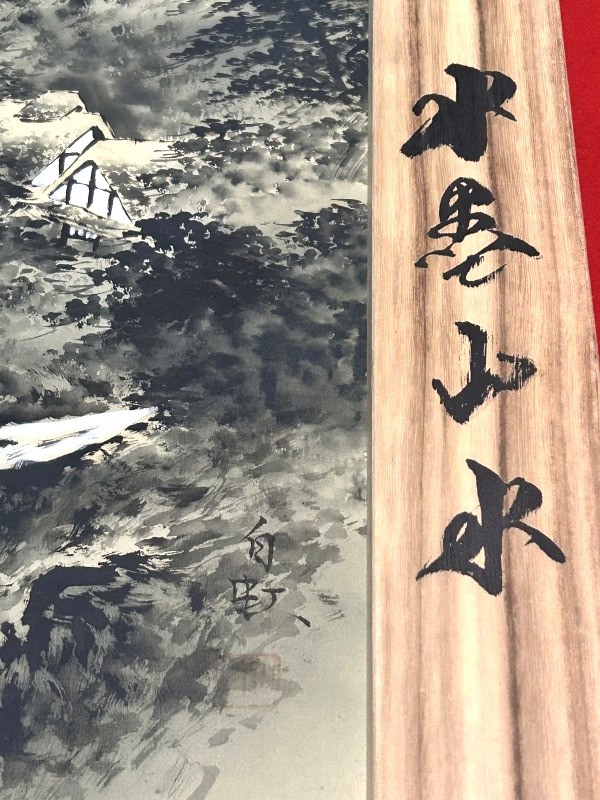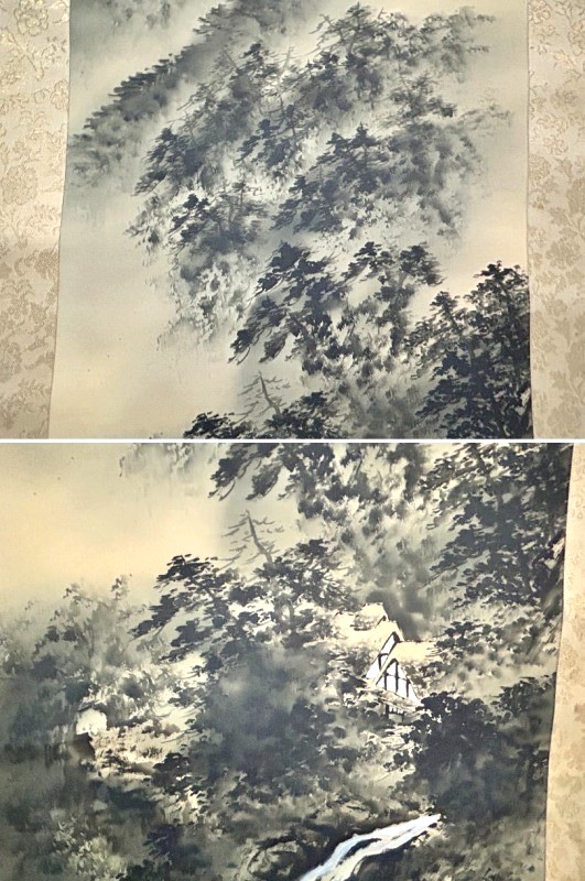> ◇一幅に宿る財の流れ/財運招来【 白苑/白銘 掛軸「水墨山水図」墨の滝図 落款/箱書きあり】渓流 水墨画 景色 風景画 Q07169
