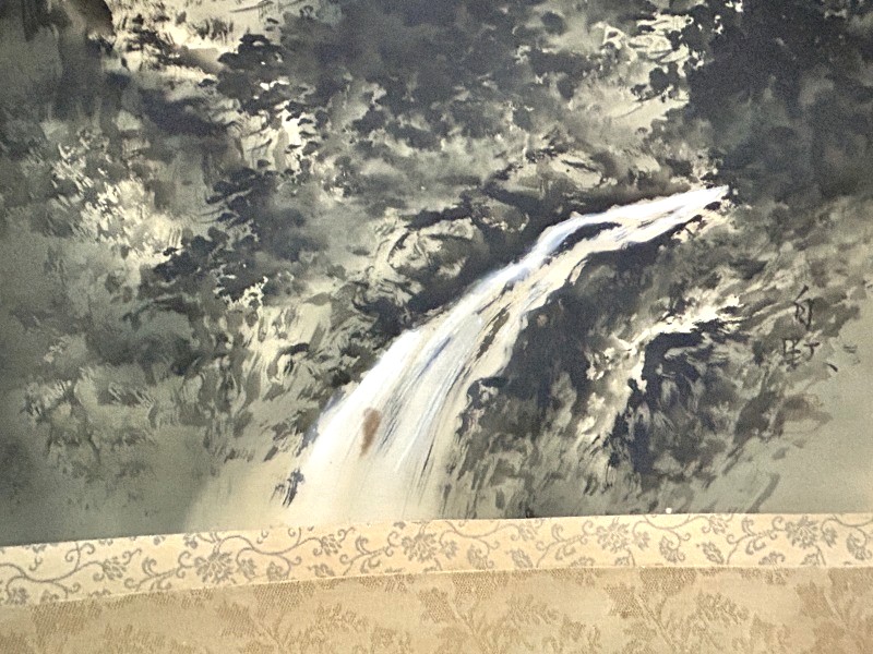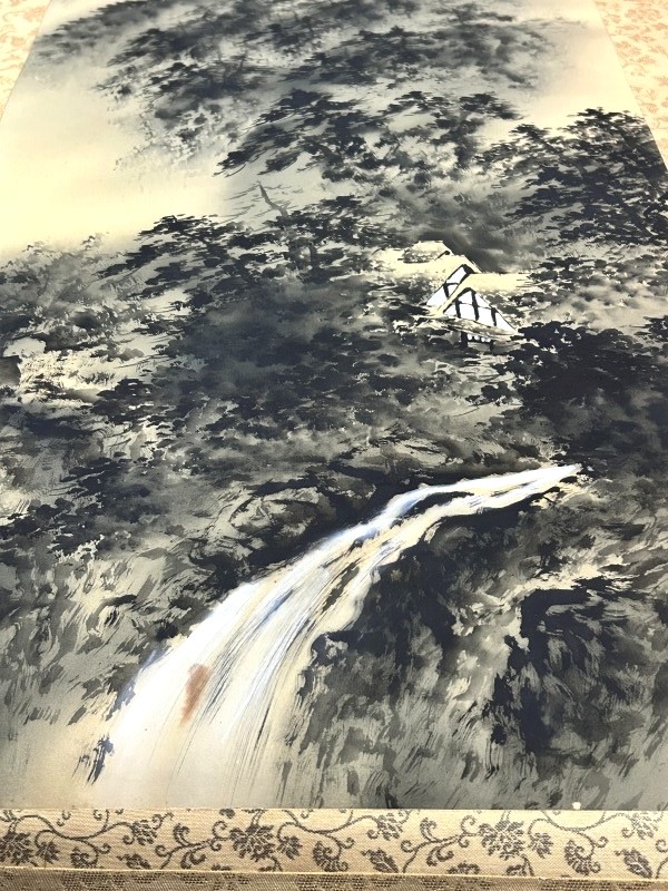 - ◇一幅に宿る財の流れ/財運招来【 白苑/白銘 掛軸「水墨山水図」墨の滝図 落款/箱書きあり】渓流 水墨画 景色 風景画 Q07169