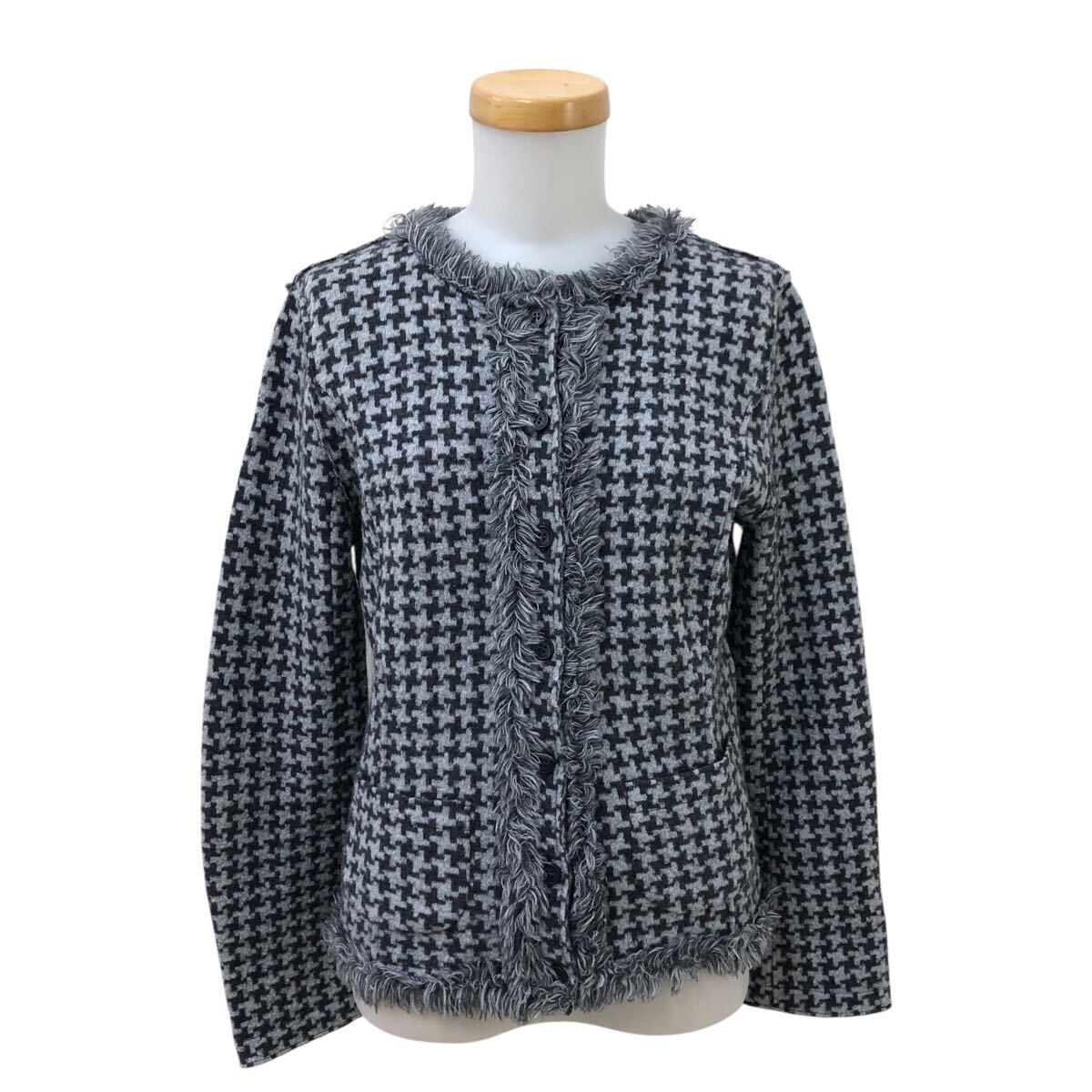 - 11Nm337-62 Leilian レリアン 千鳥柄 ウール ノーカラー フリンジ ジャケット 上着 羽織り アウター グレー レディース 9 日本製