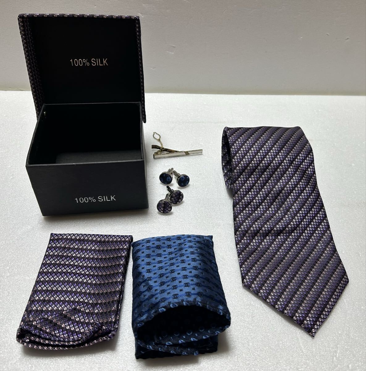 - 【中古】メンズ ネクタイ シルク チーフ カフス タイピン セット ケース付き ビジネス フォーマル
