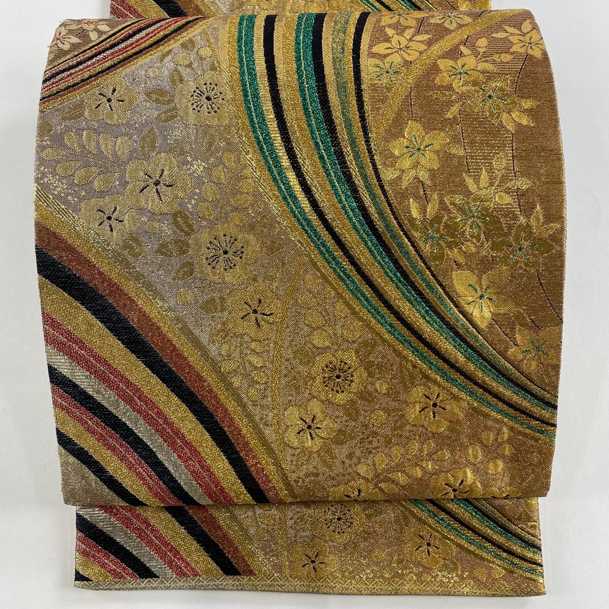- 袋帯 秀品 草花 斜縞 金糸 箔 金色 六通 正絹 【中古】