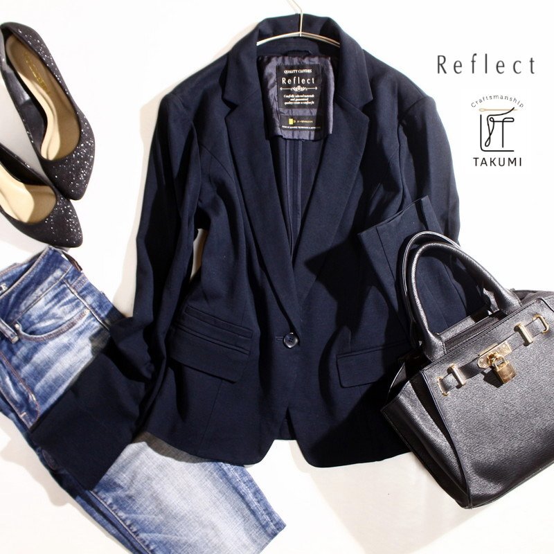 > 美品 Reflect リフレクト 株) ワールド ストレッチ 綺麗ライン 匠ジャケット テーラードジャケット ネイビー 紺 9号 Mサイズ ジャケット