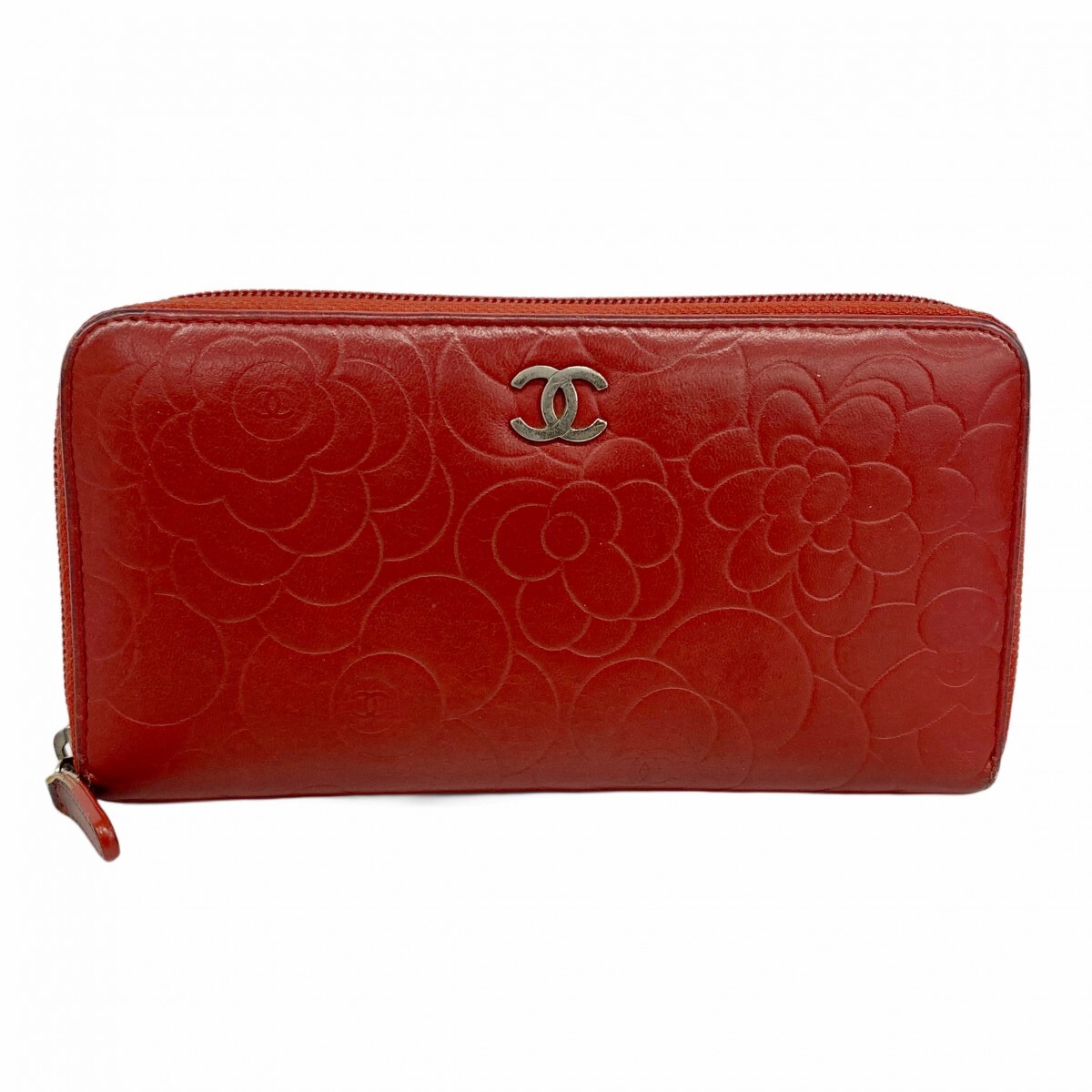 - 【5ob0608】シャネル 長財布 カメリア レザー レッド シルバー金具【中古】レディース