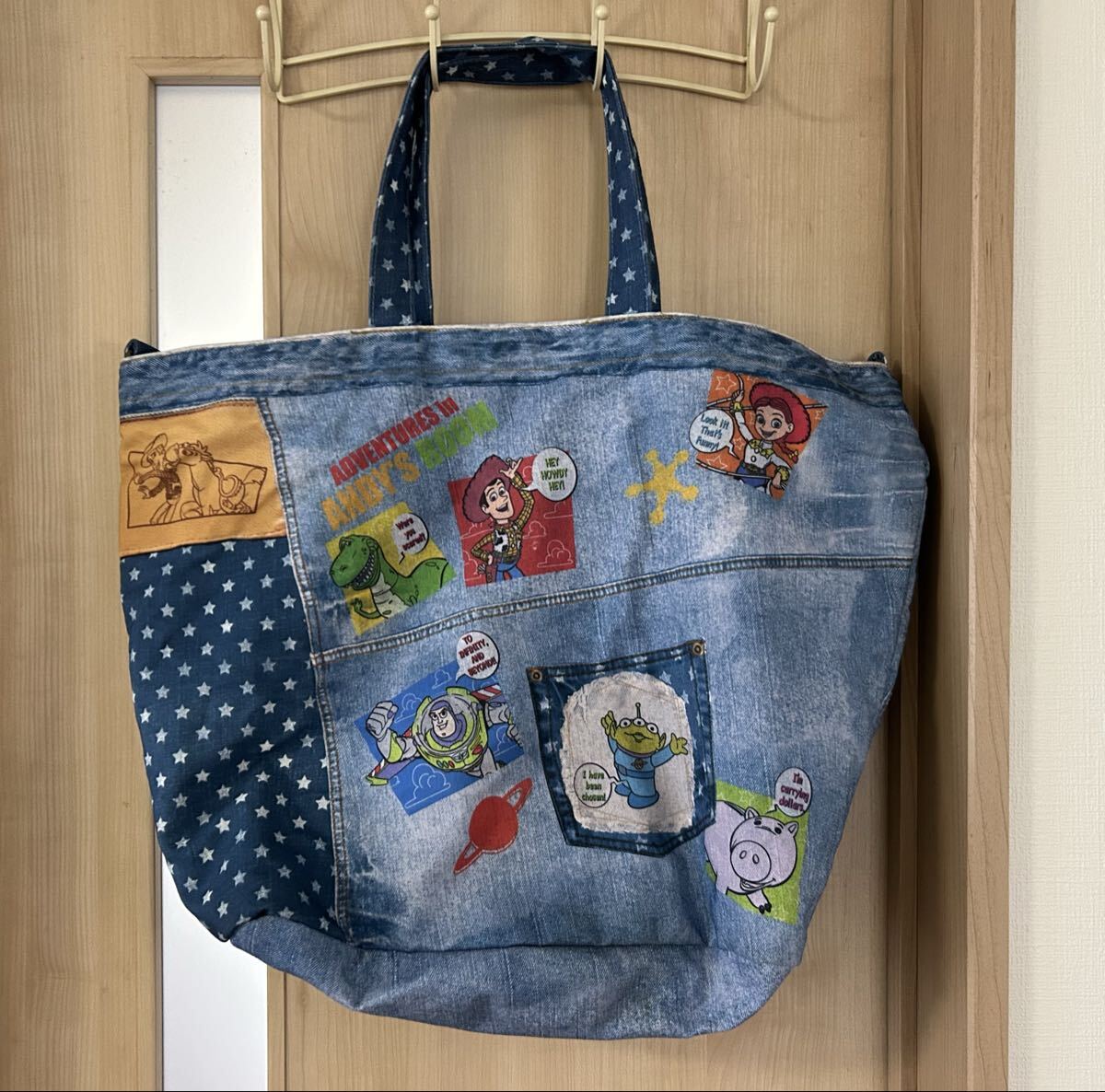 - 中古美品 TDL 東京ディズニーシー トイストーリー デニムバック トートバッグ リメイク風 大きめ