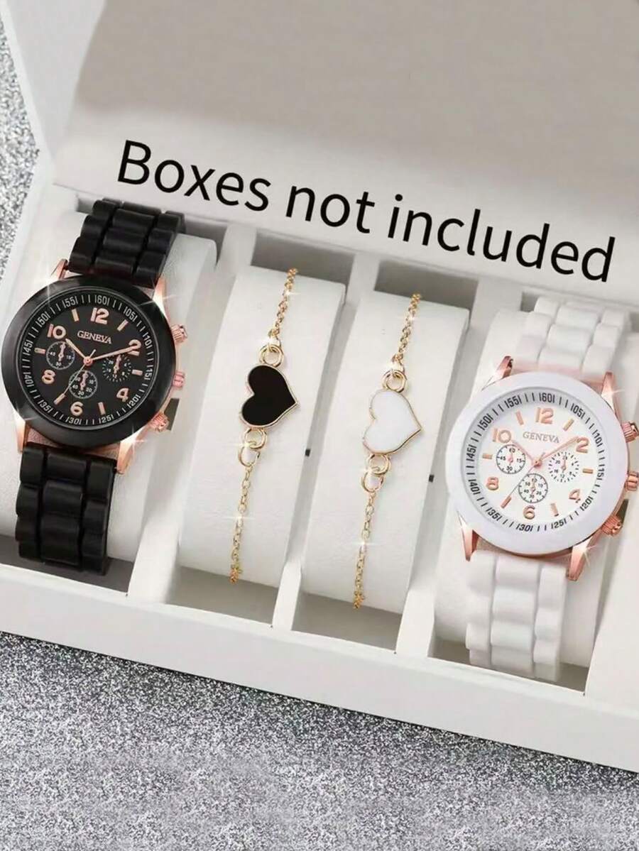 > 腕時計 レディース セット ファッションカジュアルカップルクォーツ腕時計4個セット、ブラックとホワイトから選択可能、ハートブレスレ
