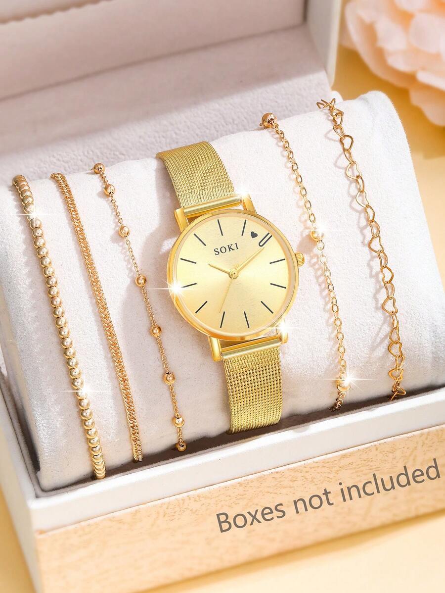 > 腕時計 レディース セット 女性用ファッション カジュアル 丸型ダイヤル クォーツ腕時計 シンプルチェーンブレスレットセット、毎日