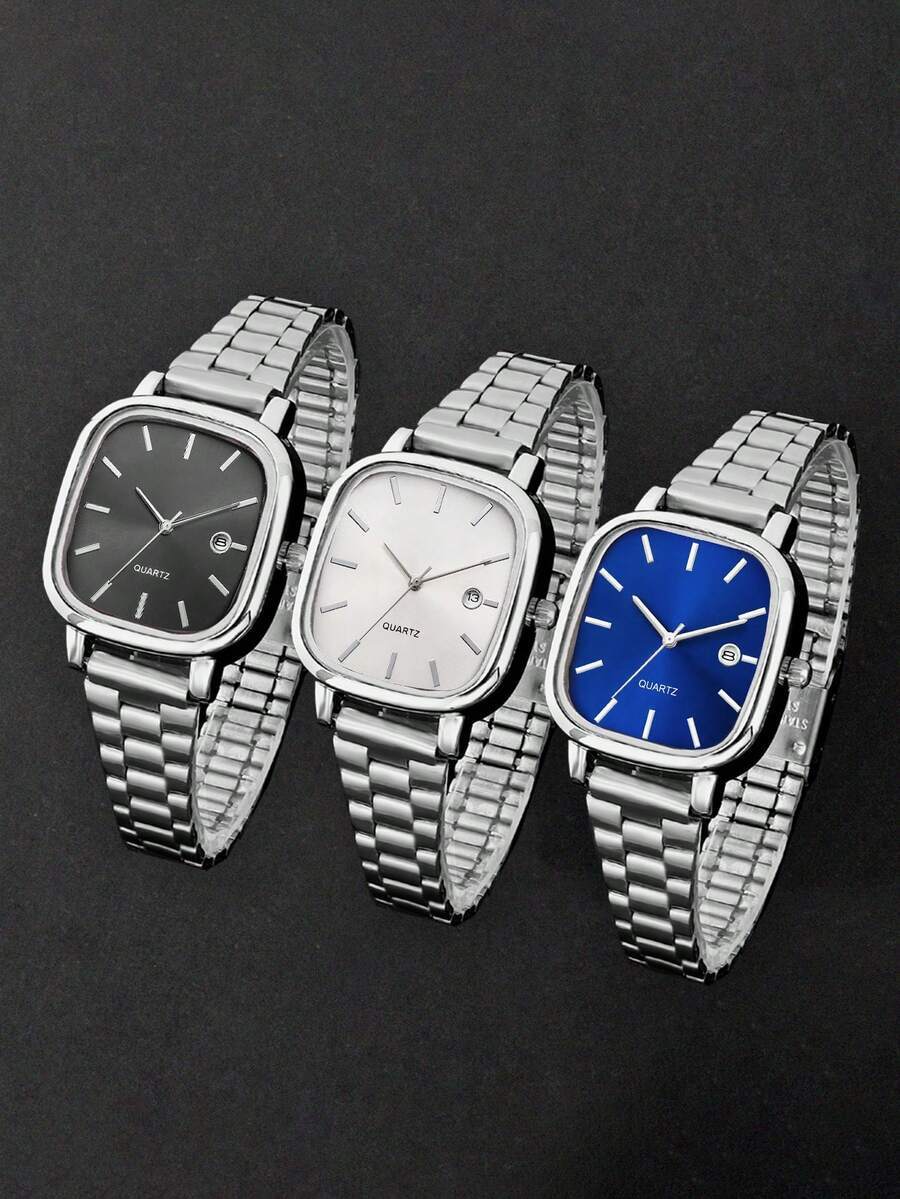 - 腕時計 メンズ セット 3個セット メンズビジネス合金ストラップ スクエアダイアル カレンダー クォーツ腕時計、日常使いや休日に最