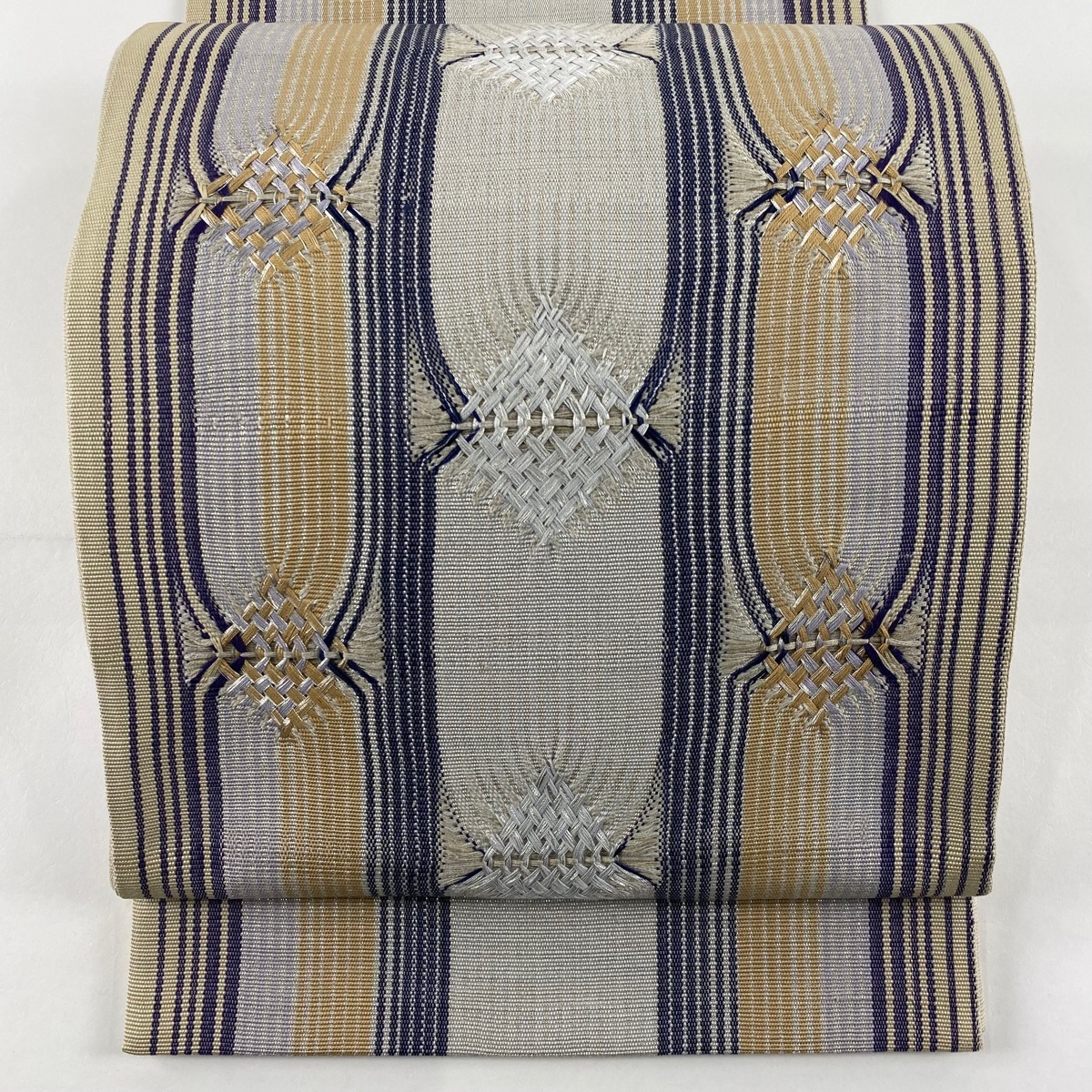 - 袋帯 秀品 縞 幾何学模様 銀糸 灰茶 お太鼓柄 正絹 【中古】