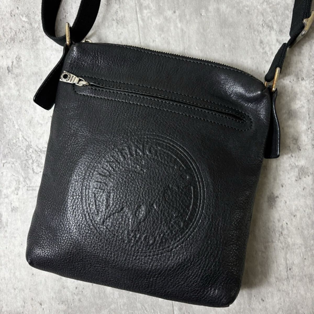 > 極美品/近年モデル●HUNTING WORLD ハンティングワールド ショルダーバッグ 斜め掛け デカロゴ エンボス レザー 本革 ビジネス メンズ 黒