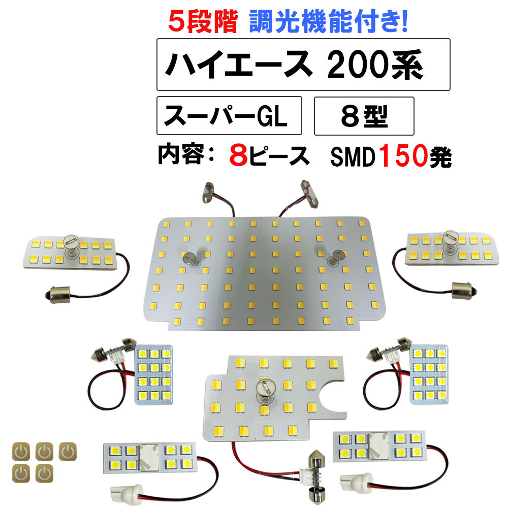 - 【互換品】ハイエース 200系 8型 スーパーGL 5段階調光機能付き LEDルームランプ 8p SMD150発 3色切り替え