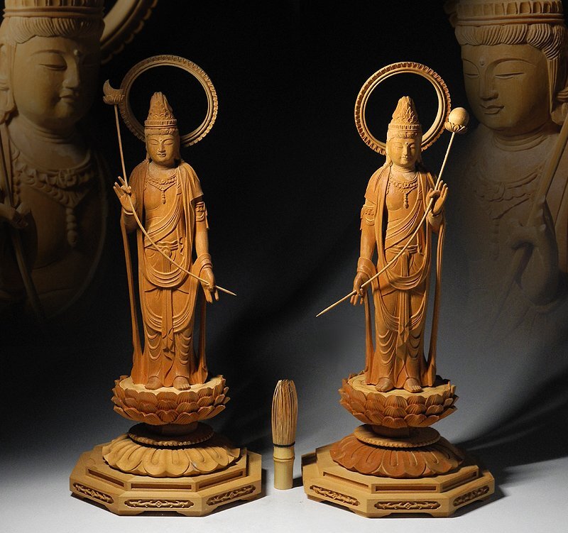 > 緑屋i■ 仏教美術 木彫 日光菩薩像 月光菩薩像 脇侍 仏像 一対(2点) 高約42.5cm i9/1107-7/22-4#120