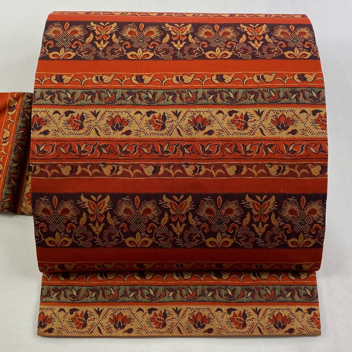 > 【美品】 名古屋帯 優品 紬地 草花 蝶 朱色 正絹 【中古】