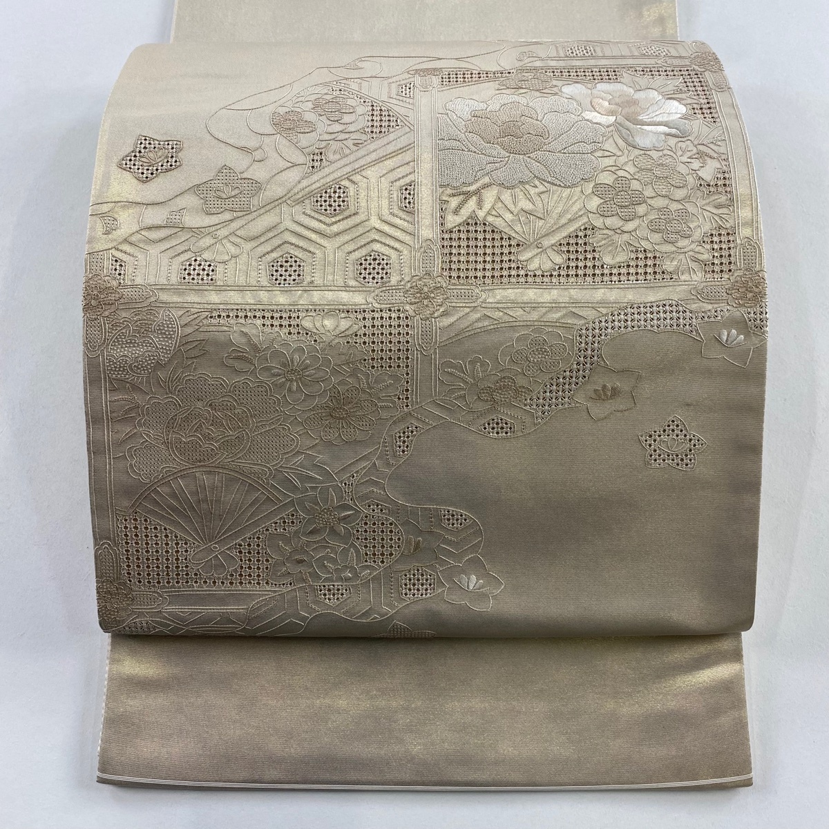 - 袋帯 秀品 関西仕立て 草花 扇 刺繍 金色 お太鼓柄 正絹 【中古】