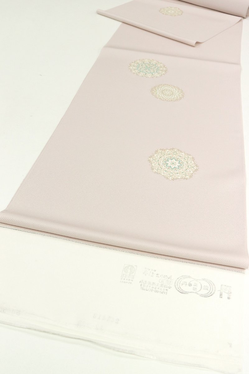 しっとりとした上質な生地は、くすみピンク色のお色目でございます。 白色、翡翠色、白鼠色色のお色目で華文が染められ優美な雰囲気でございます。 模様には金彩の縁取りが施されており、柄行に上品さと華やかさを加えております。 美しい着姿を演出してくれることでしょう。 -状態・素材:正絹 -落款・証紙: -参考着用年代:20代~幅広い年代でお召しいただけます。 -着用時期 :10月~5月