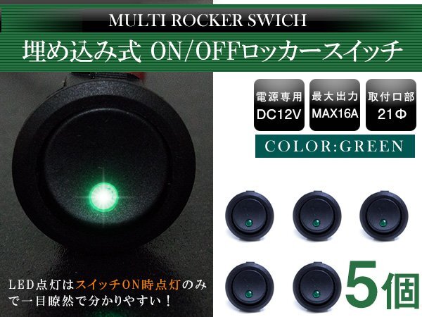 - 『5個』丸型 ON/OFFスイッチ 21mm 21φ ロッカースイッチ 12V グリーン 緑 船 キャンピングカー 埋め込み 増設スイッチ 丸ボタン