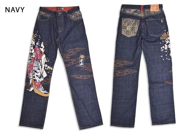- 抜刀娘 結愛花魁デニムパンツ◆抜刀娘 ネイビー 36inch 36インチ 254248 和柄 和風 刺繍 ジーンズ 着物 桜 さくら