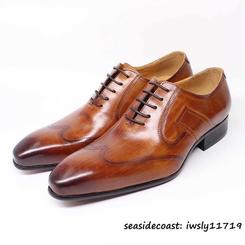 - 超希少◆定価9万 メンズシューズ ビジネスシューズ 高級牛革 本革レザーシューズ 紳士靴 革靴 職人手作り 彫り フォーマル ブラウン 24.5cm