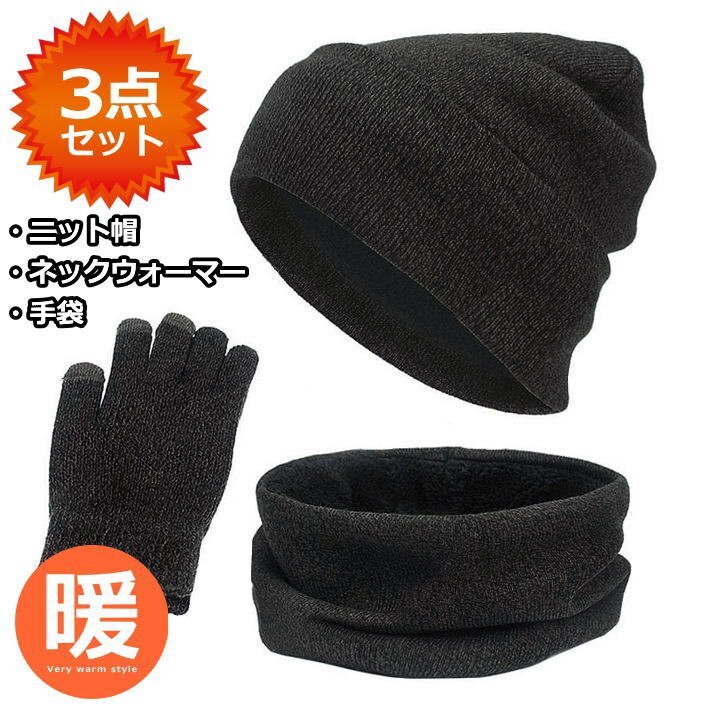 - お得な3点セット ニット帽 ネックウォーマー 手袋 ニットキャップ マフラー 裏ボア メンズ レディース 7986934 杢チャコール 新品