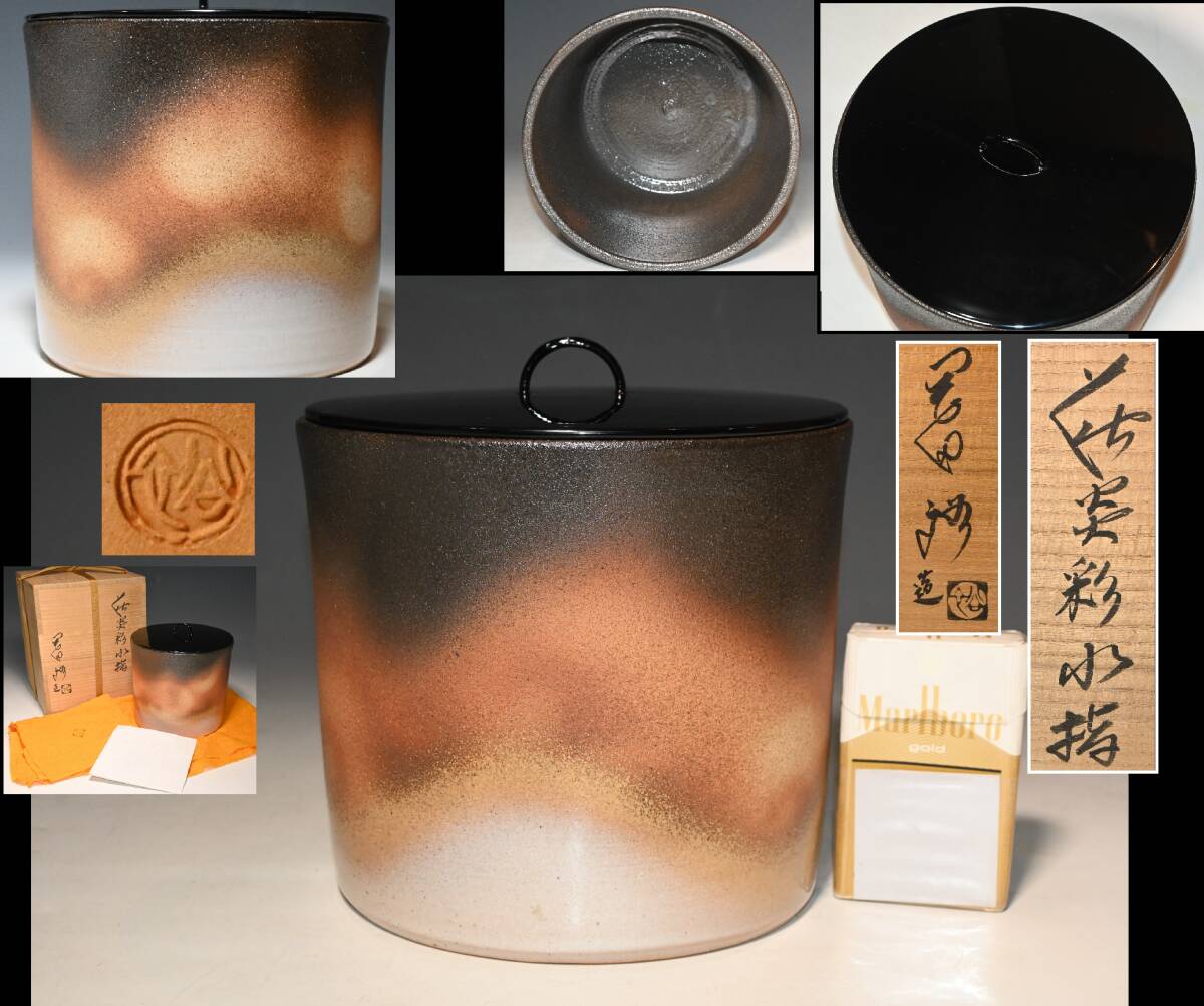 - 真贋保証■岡田裕 造■ 萩淡彩水指 漆蓋 共箱・共布・栞 萩焼 山口県光市生 七代岡田仙舟に師事 窯変 茶道具 水器 水差 慶応義塾大学卒