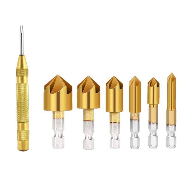 - 【vaps_3】面取りカッター 皿取り錐ドリル ビット 7本セット 皿取錐 下穴錐 ザグリ 六角軸 チタンコーティング 板 基板 送込