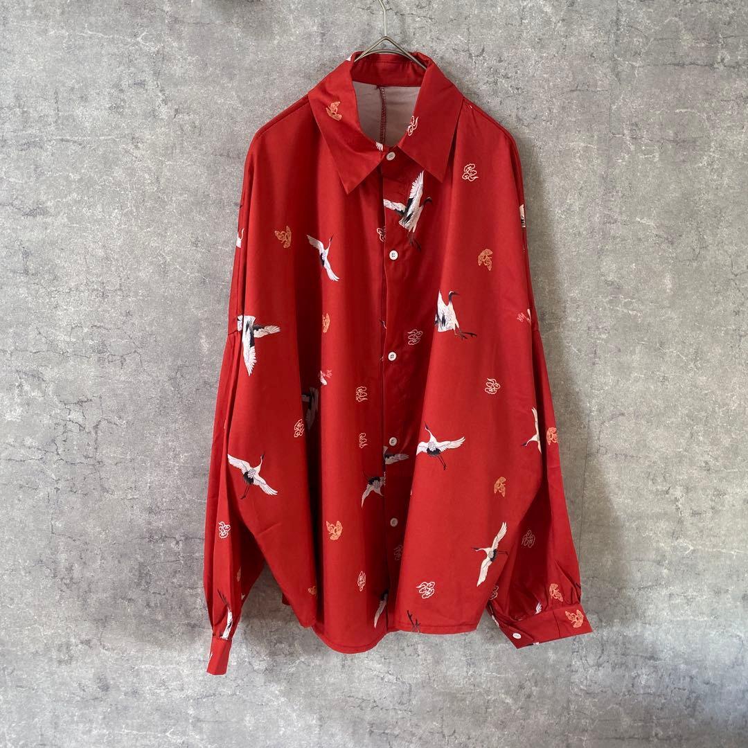 - 鶴柄シャツ 長袖 ポリシャツ サラサラ生地 和柄 オーバーサイズ フリーサイズ