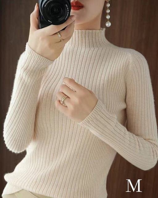 - ニットトップス レディース 秋冬 40代 長袖セーター 無地 ボトルネック ショット丈セーター 細身プルオーバー オシャレ ベージュm