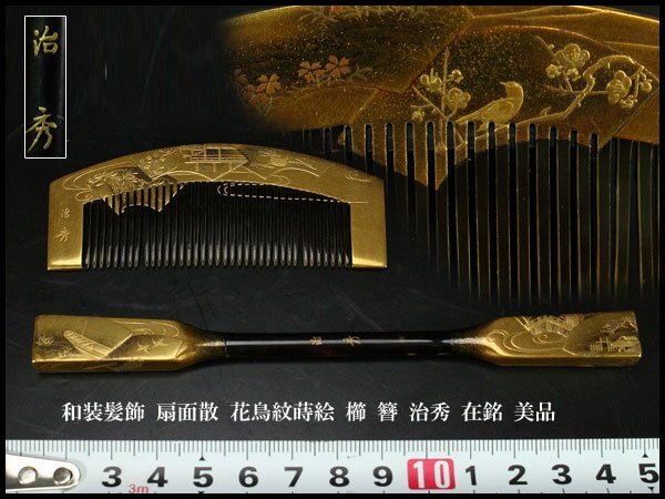 - 【金閣】和装髪飾 扇面散 花鳥紋蒔絵 櫛 簪 治秀 在銘 美品 旧家蔵出 送料無料(MG934)