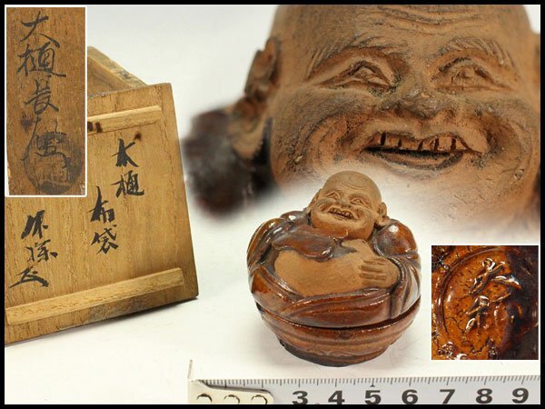 - 【金閣】茶道具 大樋長左衛門 造 布袋 香合 書付 旧家蔵出 送料無料(ZE396)