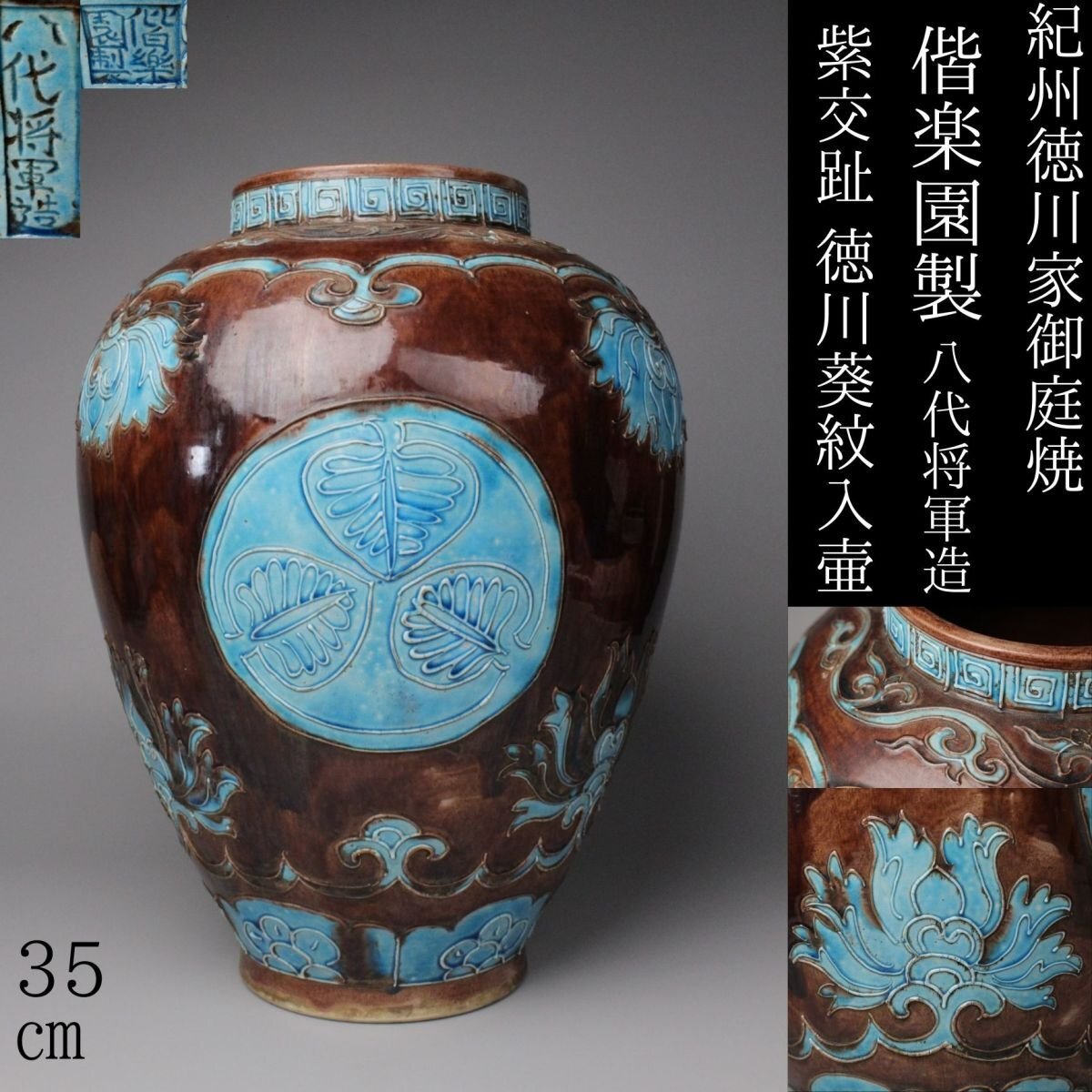 > 【LIG】紀州徳川家御庭焼 偕楽園製 八代将軍造 紫交趾 徳川葵紋入壷 35㎝ 花瓶 和歌山古陶 古美術品 旧家収蔵品[.EE]25.09