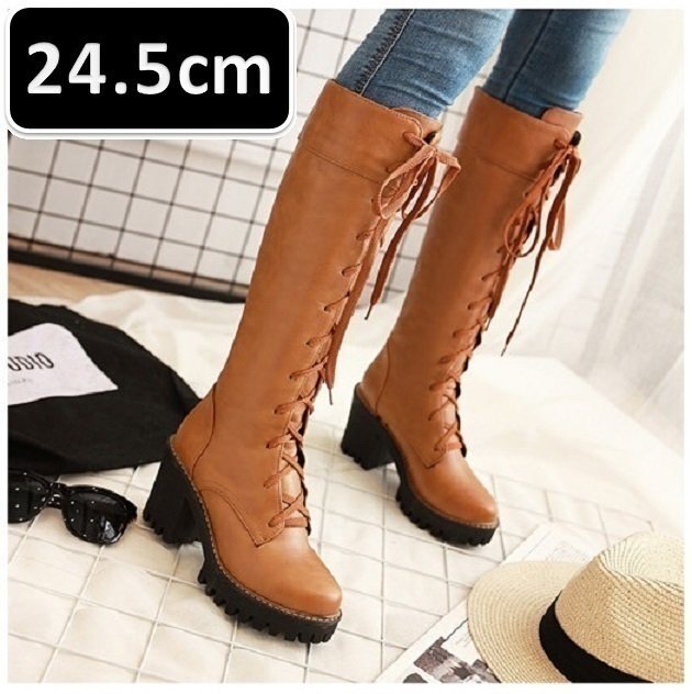 - 秋冬 フロック ニーハイブーツ ブラウン 24.5cm レースアップ ロングブーツ ハイヒール ブーツ 腿高 靴 美脚 新品 ☆197