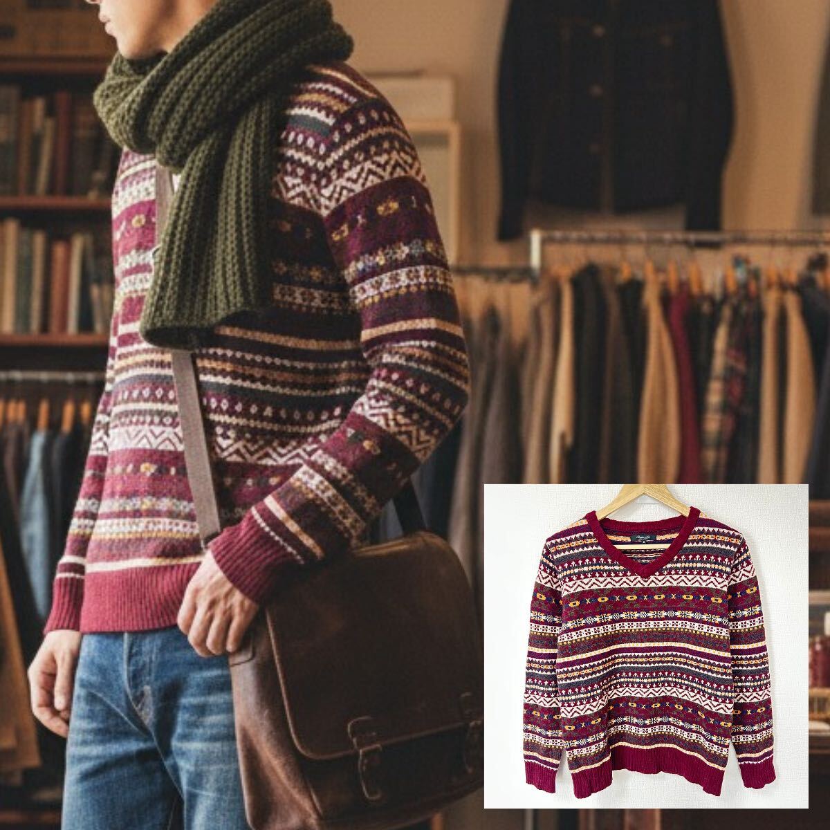 > 北欧風◎【Rhythm of Life】リズムオブライフ ユナイテッドアローズ Vネックニットセーター トップス ウール ボルドー系 メンズM/Y38187YY