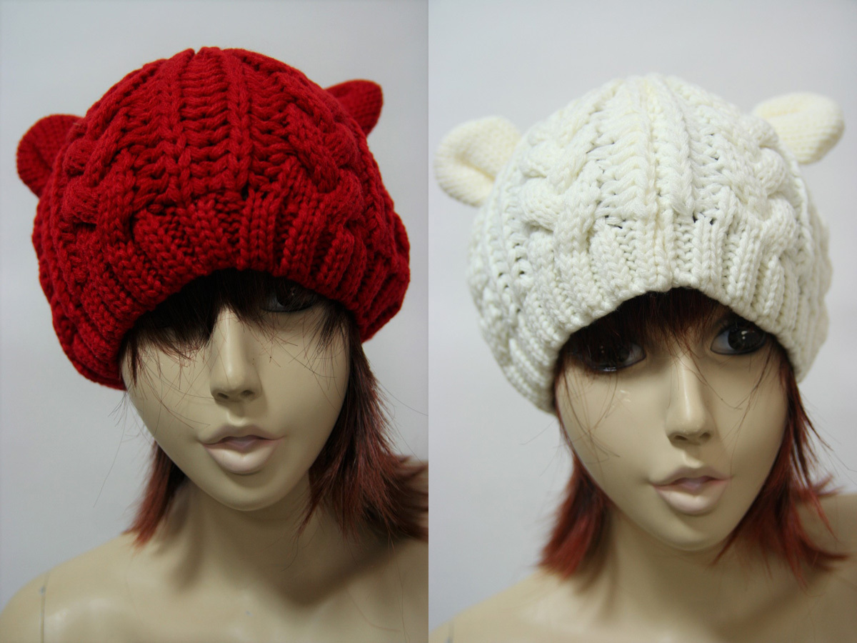 > 送料無料◆2色組◆プレーンカラー◆手編み風◆冬物帽子◆ふんわりあったか◆ネコ耳付き◆ニット帽(レッド&ホワイトクリーム)fas-440