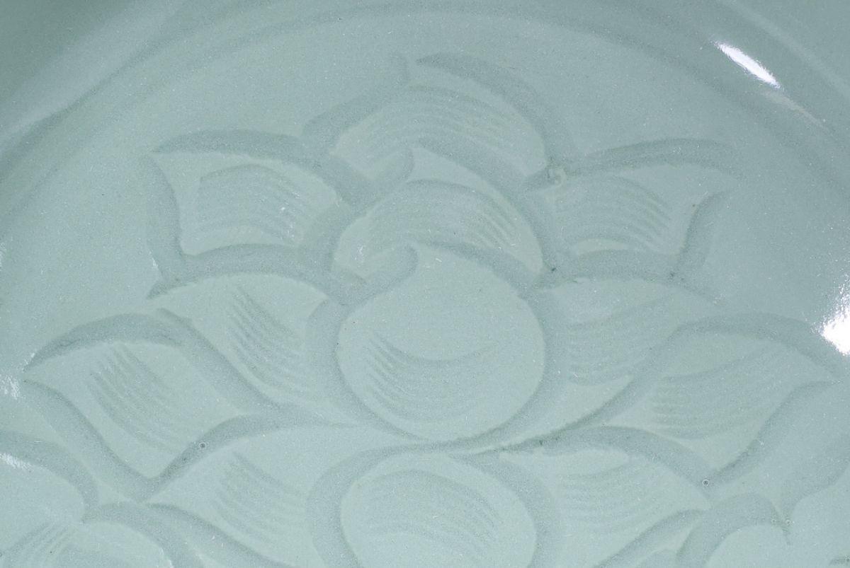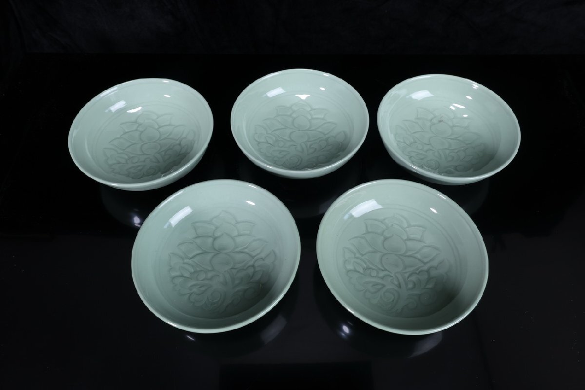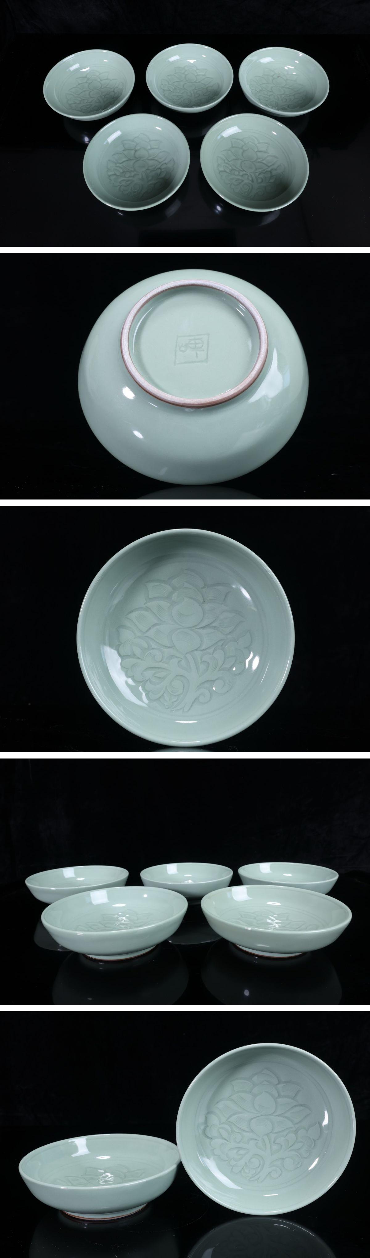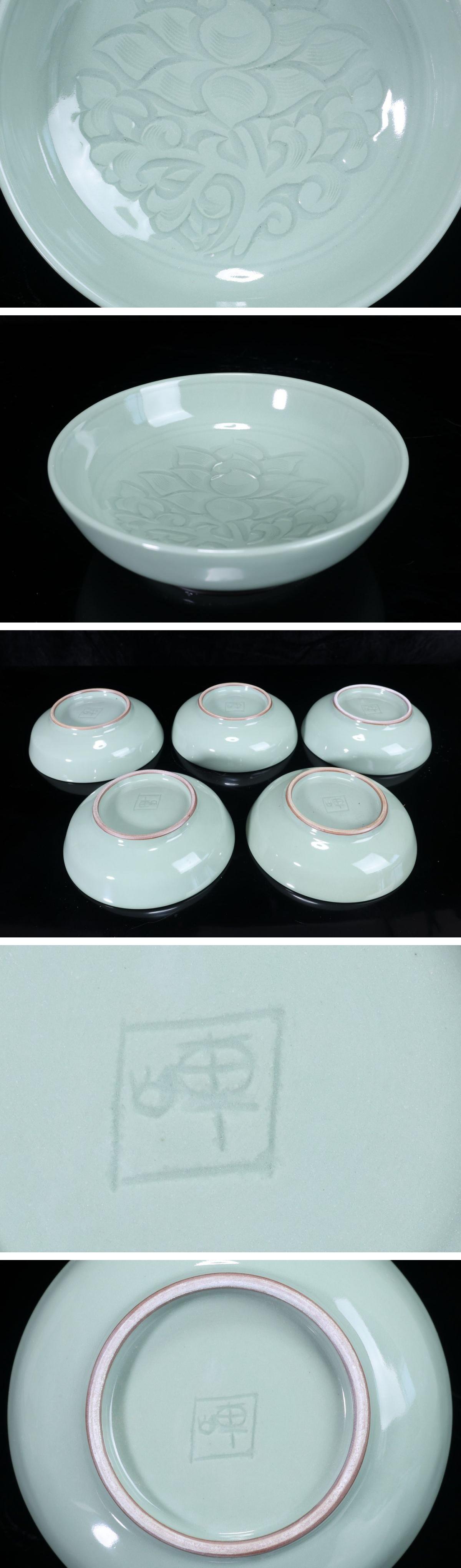 - 【珍品堂】1円から P98-V1 京焼 青磁 宮永東山造 牡丹紋 青磁 皿 銘々皿 在銘 鉢 5客 径11.5cm 食器 骨董品 古美術 時代物 コレクション