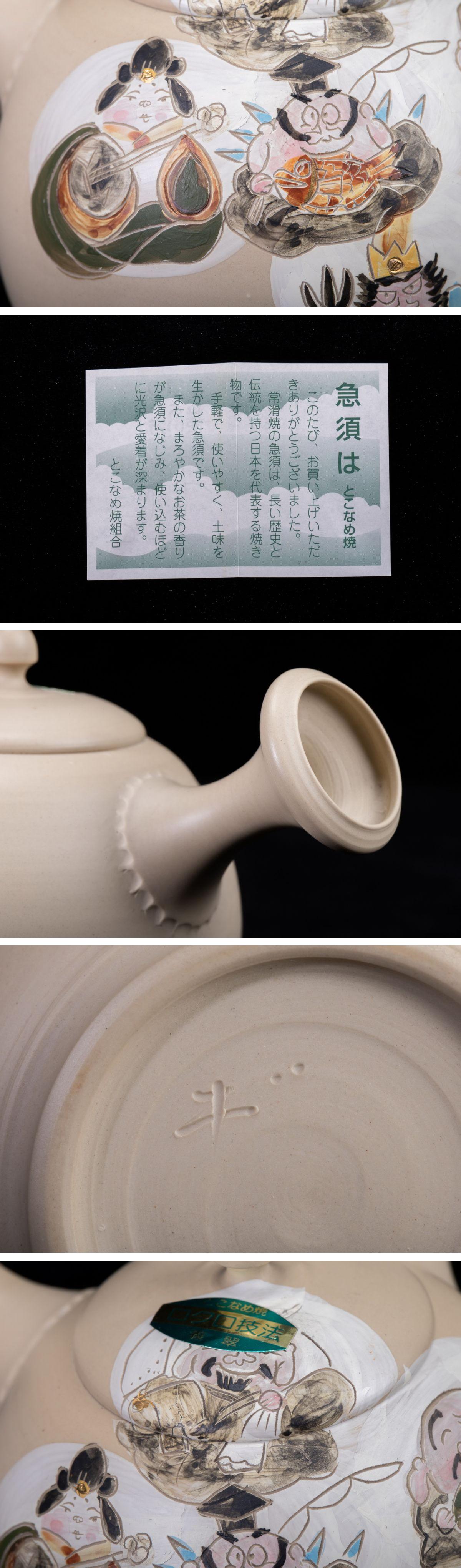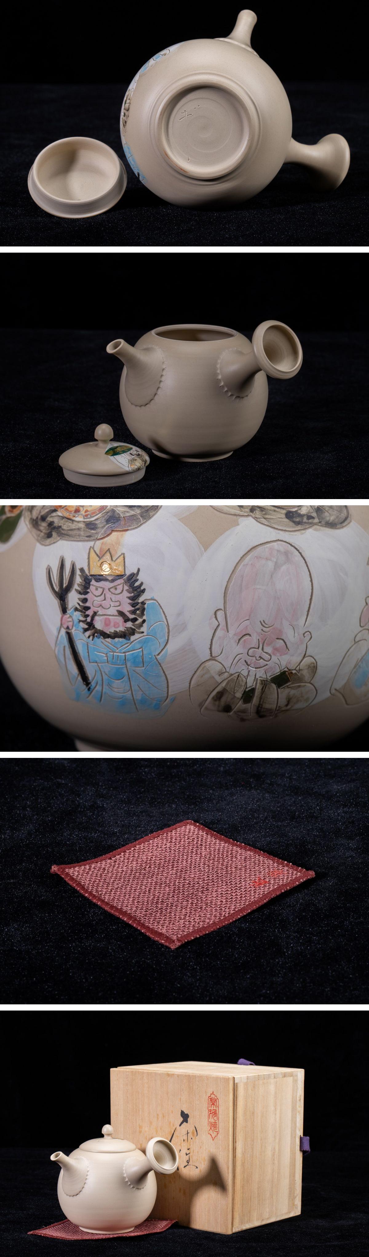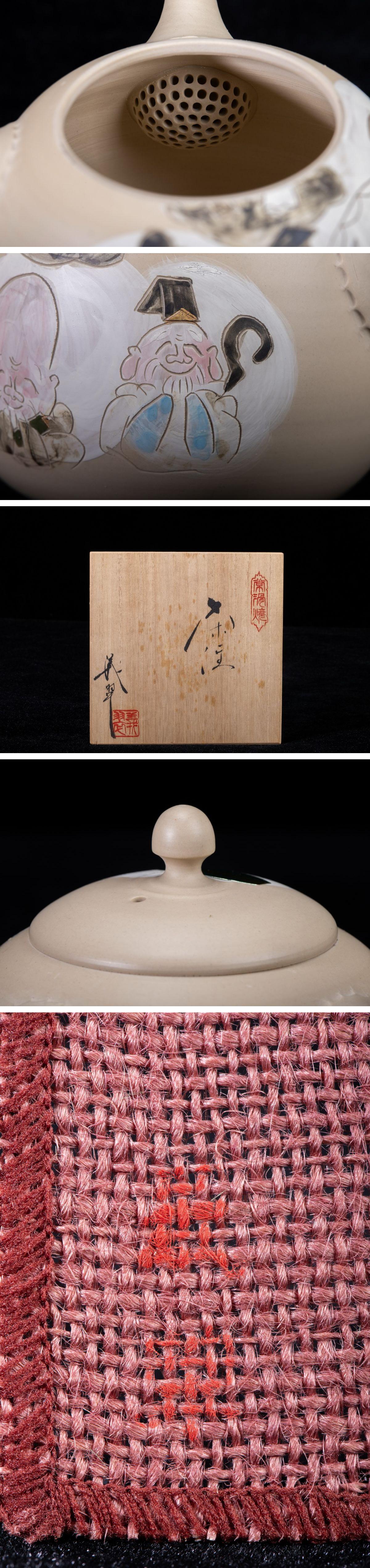 > 【珍品堂】1円から N7-V5 常滑焼 近藤義和 作 在銘 白泥 七福神 繊細絵付 急須 高10㎝ 共箱 木箱 煎茶道具 茶器 古美術 時代物 骨董品