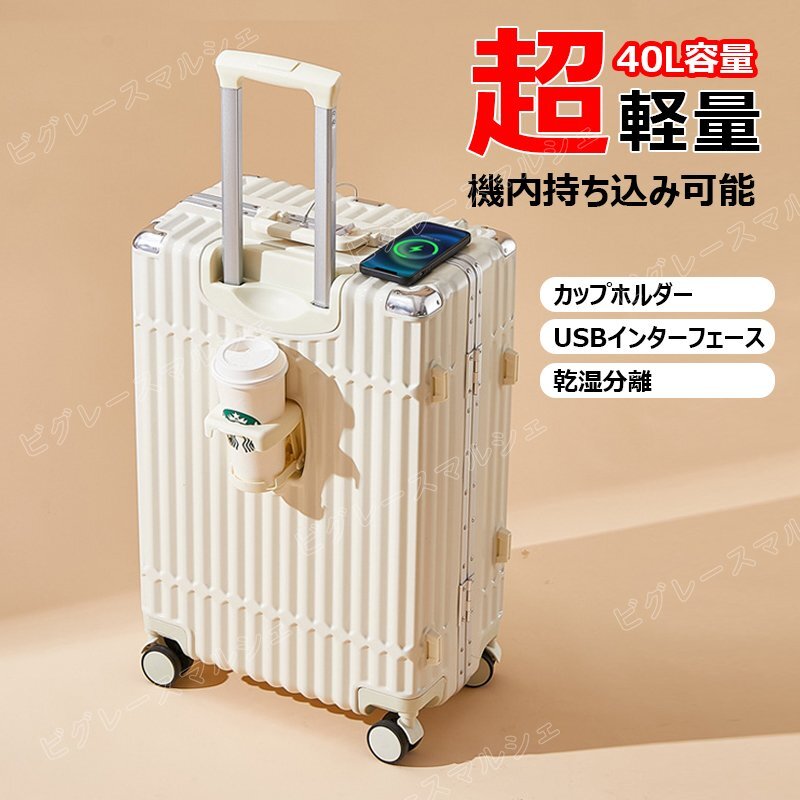 - 新登場 スーツケース 軽量3.7KG キャリーケース 大容量 40L 多機能 360度回転 静音 USBポート付き 旅行 ホワイト hw1169wt