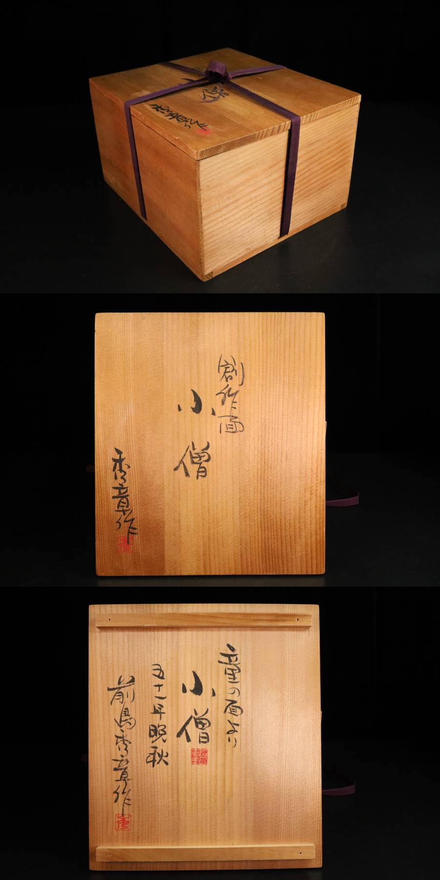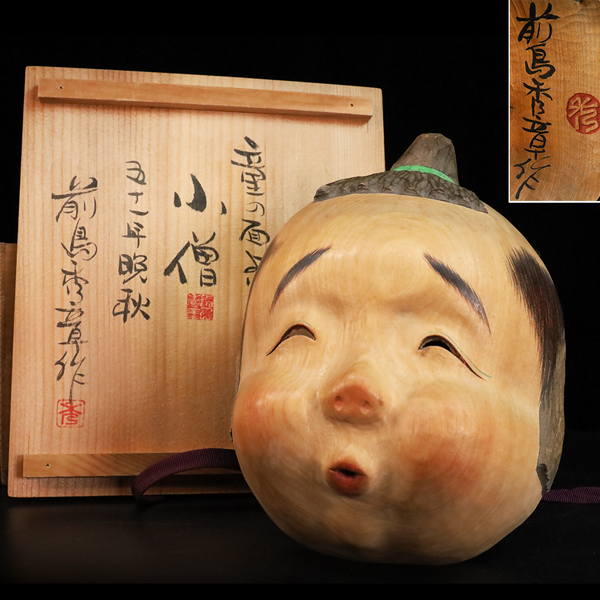 > ◇雅◇ 真作保証 彫刻家 前島秀章 作 創作面 「小僧」 在銘 直筆サイン入 高21cm/280g 木彫面 飾面 共箱 /FT.25.10 [B139] UQN